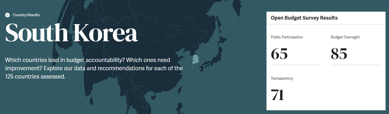 예산투명성을 평가한다는 것은 단순히 정보의 공개에서 그치는 것이 아니라 재정을 투명하게 운용하고 주민들에게 공개하는 것, 이러한 내용이 주민들이 잘 활용할 수 있도록 제공하는 것을 기본으로 합니다. 특히 정부의 살림살이를 위한 행정부와 의회의 역할, 행정부를 견제하는 기구의 존재까지 모두 종합적으로 평가하는 것입니다.